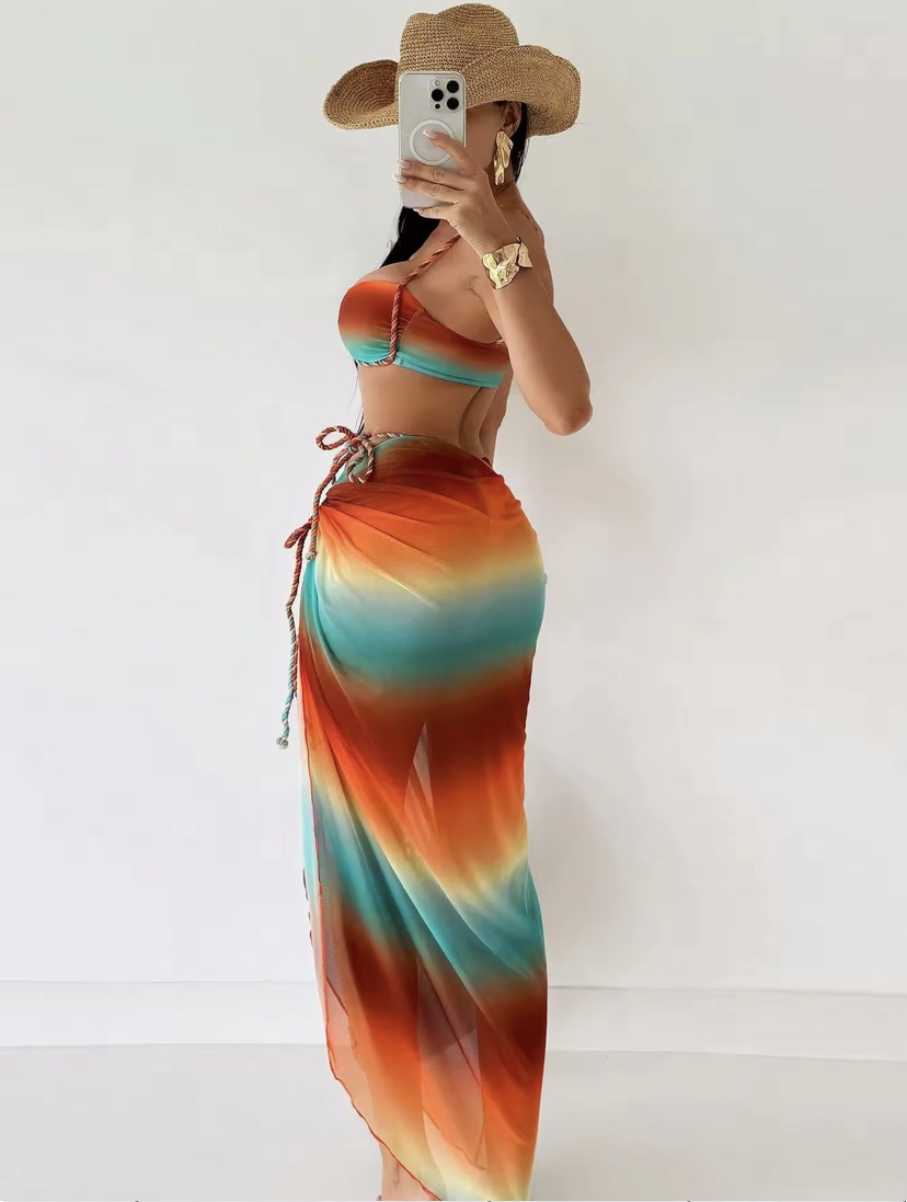 3 Piece Gradient Sexy Bikini with Mesh Split Skirt Cover Up